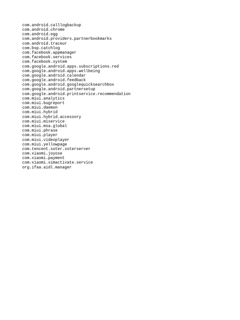 This document lists the package names of various apps and services installed on an Android device. It includes both pre-installed Google apps like Gmail and Chrome as well as third-party apps from manufacturers like Xiaomi and Facebook. The list contains over 30 package names covering everything from system utilities to multimedia and payment apps.
