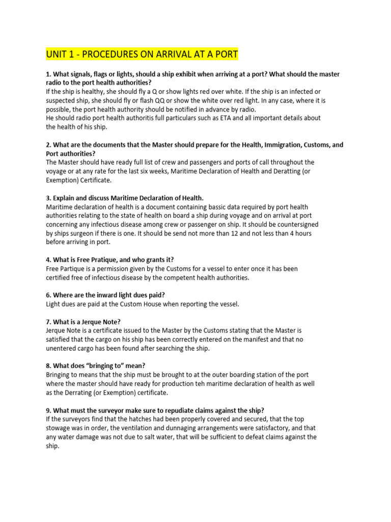 1. What signals, flags or lights, should a ship exhibit when arriving at a port? What should the master