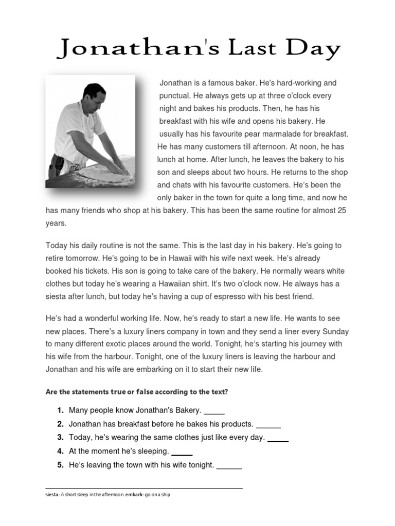 2 Jonathan has breakfast before he bakes False “He always gets up at three o'clock every