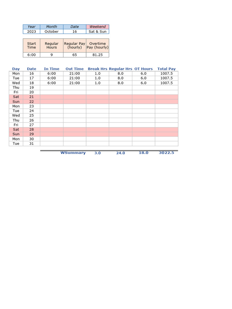 Day Date In Time Out Time Break Hrs Regular Hrs OT Hours Total Pay