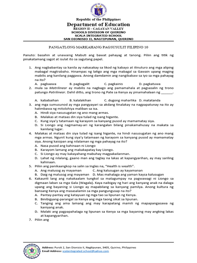PANGATLONG MARKAHANG PAGSUSULIT FILIPINO 10