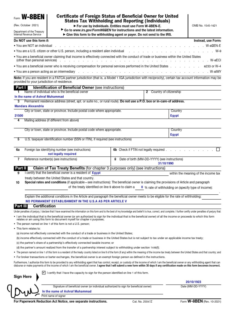 For Paperwork Reduction Act Notice, see separate instructions. Cat. No. 25047Z Form W-8BEN (Rev. 10-2021)