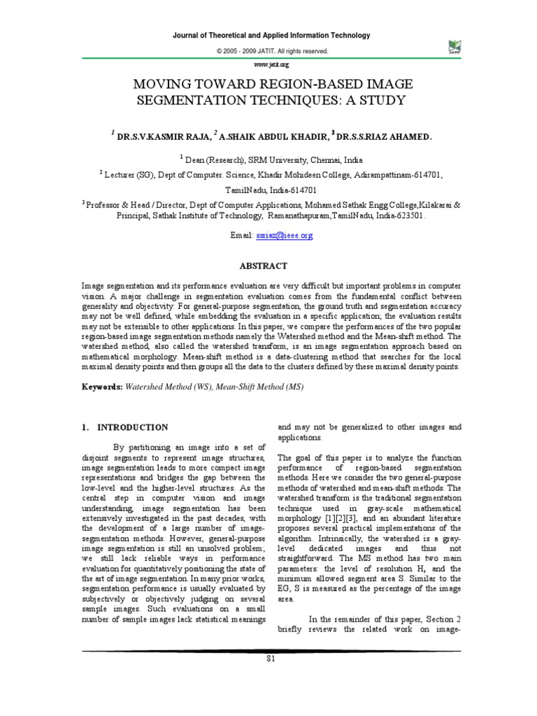 and may not be generalized to other images and applications. The goal of this paper is to analyze the function performance of region-based segmentation methods. Here we consider the two general-purpose methods of watershed and mean-shift methods. The watershed transform is the traditional segmentation technique used in gray-scale mathematical morphology [1][2][3], and an abundant literature proposes several practical implementations of the algorithm. Intrinsically, the watershed is a graylevel dedicated images and thus not straightforward. The MS method has two main parameters: the level of resolution Hs and the minimum allowed segment area S. Similar to the EG, S is measured as the percentage of the image area. In the remainder of this paper, Section 2 briefly reviews the related work on image81