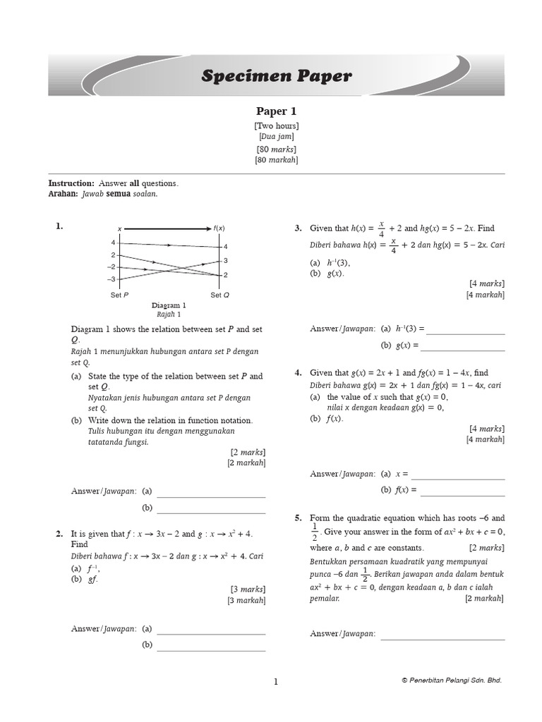 Diagram 1 shows the relation between set P and set Answer / Jawapan: (a) h–1(3) =