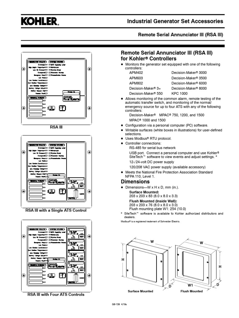 RSA III with a Single ATS Control Flush mounting plate W1: 254 (10.0)