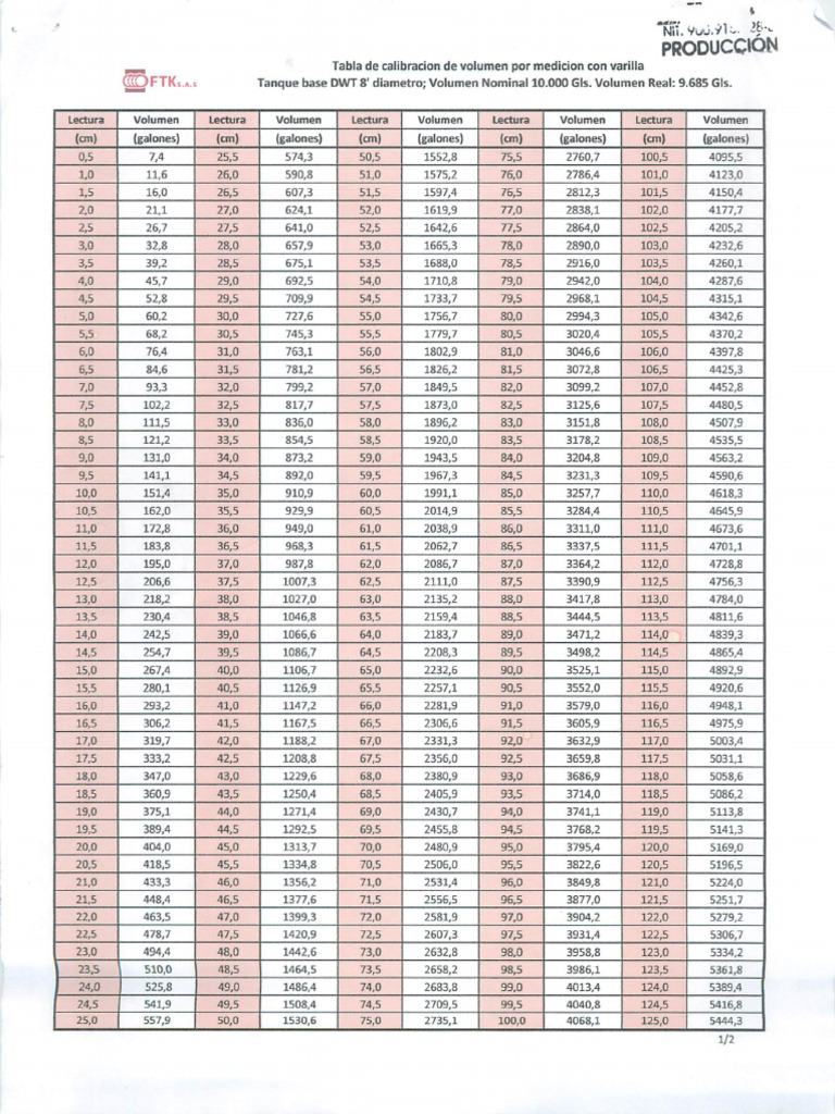 ‘Tabla de calibracion de volumen por medicion con varilla PRODUCCION