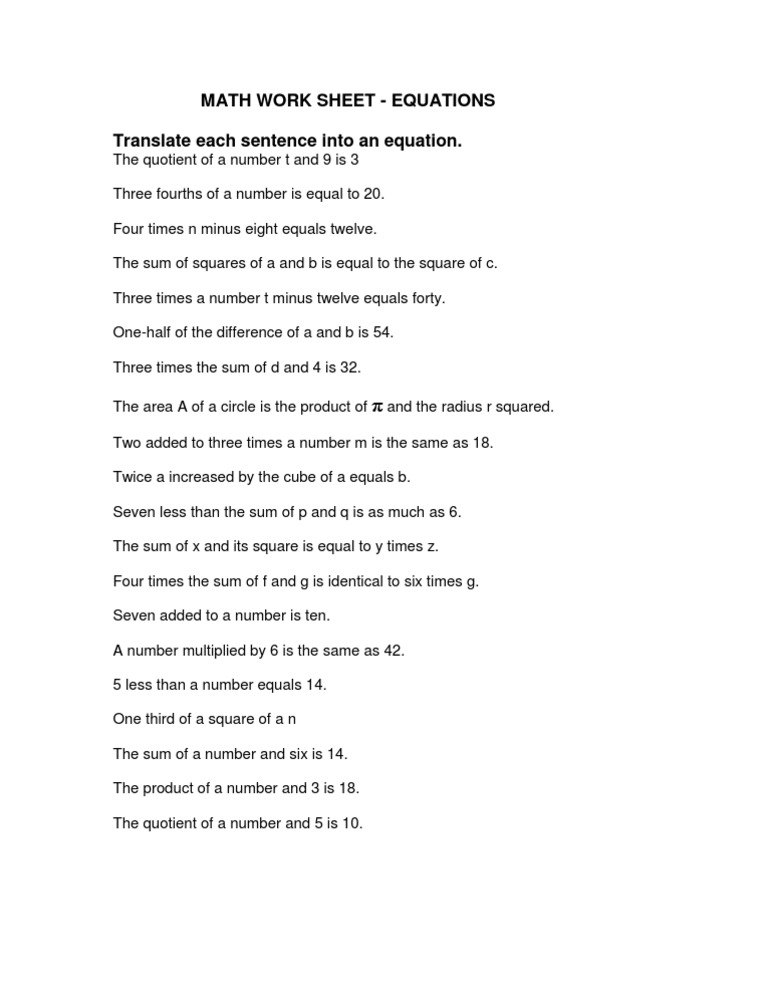 Translate Sentences to Equations Worksheet