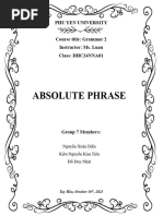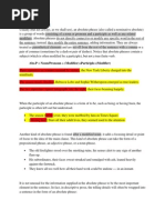 Lips painted red [nominative absolute], eyelashes heavily mascaraed [nominative absolute], Julia Roberts stood on the corner. Head twisting from side to side [nominative absolute], looking for prey [participle phrase], the owl waited patiently. Bulletproof vest securely fastened [nominative absolute], the ofcer walked down the hall, the soles of his shoes clicking on the marble oor [nominative absolute]. Its windows empty [nominative absolute], the unpainted house stood on the hill, seeming deserted [participle phrase]. Their lives nearly overn [nominative absolute], the salmon struggle upstream, exhausted [participle].