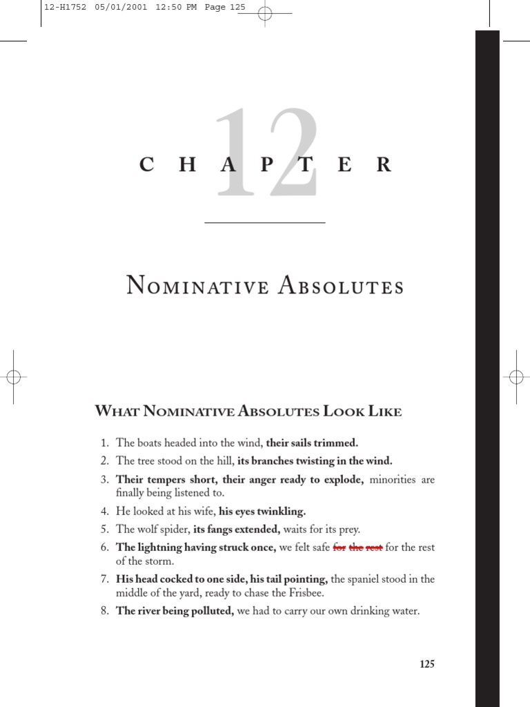 The nominative absolute is a structure not frequently heard in spoken English; you almost never hear it in a conversation between two friends. It occurs in more public communication such as the TV news and weather reports, political speeches, and public addresses. But in spite of this scarcity in oral English, the structure is very much a part of written English, not so much in the newspaper as in essays and ction. Ernest Hemingway used it extensively, thus saving his simple style from sounding simplistic.