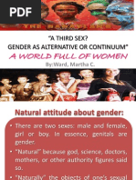 10. Her body was emaciated. Her self-esteem was destroyed. The model entered the Betty Ford Clinic. 11. The Zuni lhamanas bridged the two genders. Their physiology was male. Their dress was female. Their cultural roles were both male and female. 12. Their clothes needed washing. The missionaries looked for a Zuni to do their laundry. 13. The roles of the lhamana were exible. The lhamana, W Wha, was the only one in the pueblo who would do the laundry of outsiders. 14. The missionaries were outraged. Their religion found any deviation from two separate and distinct sexes sinful. 15. His hair was combed like a womans. His dress was the clothing of a woman. W Wha was taken for a woman in Washington D.C. 16. The anthropologist Mrs. Stevenson had many male characteristics. W Wha seems to have considered her similar to himself. 17. The face of the lhanana was covered with the mask of the Kolhamana kachina. The lhamana played the role of the lhamana kachina in various ceremonies. 18. Today berdache is the word used by anthropologists to refer to Zuni lhmanas and to people fullling a similar role in other Native American tribes. Most Native American tribes in South, Central, and North America have a special place inside the community for third-gender people. 19. The knowledge of the history of the berdache in pre-Columbian America is being restored to gay Native Americans. Gay Native Americans have a new idea of their place in tribal life. 20. The gender designators of clothing and role in the community dened the berdache in Native American cultures. Therefore, berdache cannot be translated as gay or homosexual. These terms refer only to sexual orientation in Western culture.