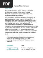 parallel zither beaten with a little stick), and deyuzey/duwagey (one-stringed coconut shell fiddle). A flute without finger holes is the lantuban, 60cm X 11mm. Tone is achieved varying the force of one's breath and the size of the flute's end hole with the fingertip. The slagi is a large gong used to call people to assembly. A regular beat announces an ordinary gathering, but a fast tempo of the slagi signifies an urgent call. Many Manobo songs are also accompanied by rhythmic sounds from the singer's dagipla (armpit), produced by the abrupt movement of the upper arm towards the body. Fotfot, sung at wakes and social gatherings, is accompanied by such sounds. A recording of Manobo music made by Priscilla Magdamo Abraham in 1957 and 1962 in the Midsayap area consists of 124 samples, out of which 33 are instrumental performances and 91 are vocal. Out of the 91 vocal pieces, only three are accompanied by instrumentation. None of the instrumental music includes drumming. On the other hand, John Garvan (1931) when he was in the Agusan Valley area in 1910, remarked that the gimbae (drum) was used all the time to accompany religious and secular dances. The people were said to be able to recognize and name 20 to 30 different drum tunes, such as the sinakaisakay, "like the movement of a raft or canoe," and kumbakumba to usa, "like the sporting of a deer." The agong, which used to be played together with the drum, has now replaced the drum altogether. Manobo vocal music consists of ritual songs which are narrative songs, lullabies, and songs of nature at the same time. An important song type is the epic song Owaging/Uwahingen, whose equivalent in the Kulaman Valley is Duyoy Taguden. Among the Cotabato Manobo, susunan is the generic term for any kind of song including the Uwaging epic. The mandata are love songs; the delinda are occupation songs, war songs, lullabies, planting and harvest songs; the minudar and mauley are funeral songs (Maquiso 1977). The nalit is a type of song that relates life experiences. Fifty songs recorded in the Midsayap area by Abraham were divided into nine groups based on occasion and purpose, listed and described here as they were in Pfeiffer (1965:10-13). Ritual songs are the following: andal, a ceremonial request for the singer to begin; ay dingding, a wake song; bityara, denediction used in the Langkat; hiya hiya humiya, sung at the Samayaan ceremony; mahudlay, wake song concerning the limukon (omen bird); manganinay, bee hunting song; masundanayen, wake song of women; masulanti, wake song dialogue between mother, daughter, and young man that ends in a riddle; panangansangan, mediums song chanted while in a trance; panlalawag, prehunt ritual song to Lalawag; tamanda, wake song considered dangerous because it attracts witches; tiwa, prehunt ritual song about lizards; and udag-udagu, prehunt song to Mahumanay. Narrative songs are the andal, introduction to the magic cycle Tulalang; bimbiya, adventures of a folk hero; idangdang, entertainment or didactic narrative; kirenteken, historical legends consisting partly of the songs of the Kirinteken Manobo living near Kamadzil; mandagan, historical tales; Tulalang, epic narrative; Tuwa, story of Tuwa; and Ulahing, epic narrative.