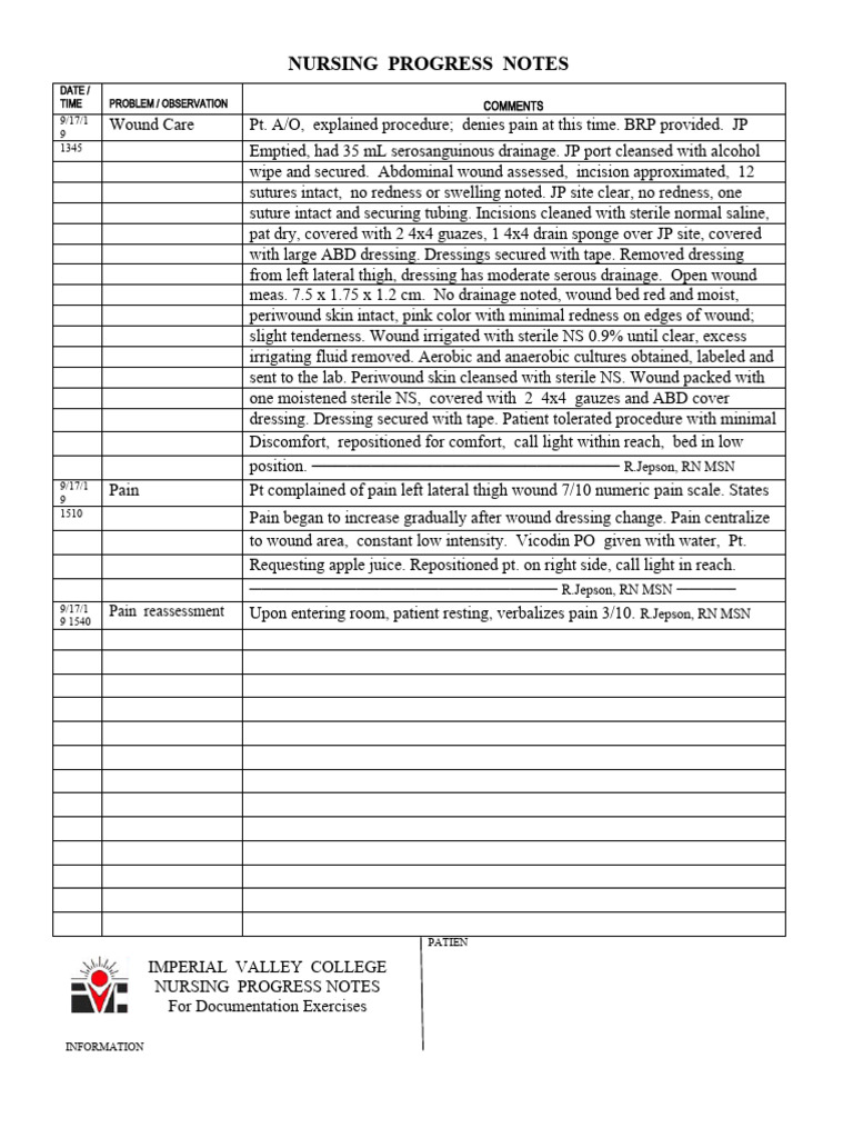 9/17/1 Wound Care Pt. A/O, explained procedure; denies pain at this time. BRP provided. JP
