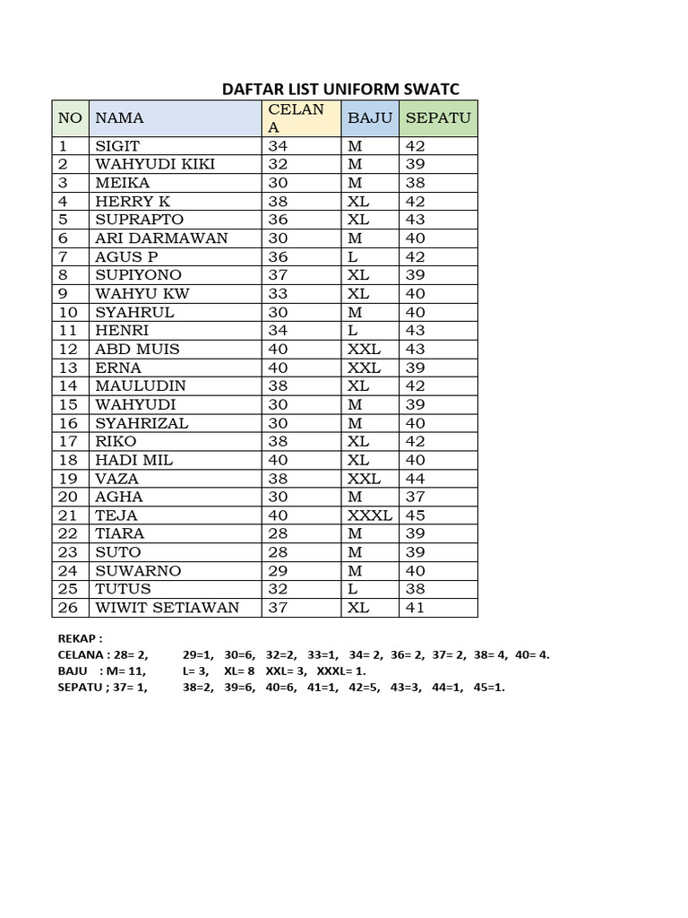 BAJU : M= 11, L= 3, XL= 8 XXL= 3, XXXL= 1.