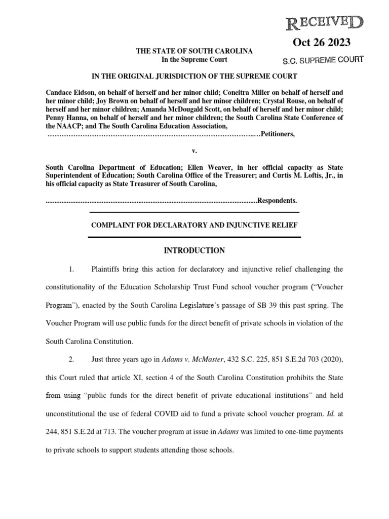 Petitioners, v. South Carolina Department of Education; Ellen Weaver, in her official capacity as State Superintendent of Education; South Carolina Office of the Treasurer; and Curtis M. Loftis, Jr., in his official capacity as State Treasurer of South Carolina, .........................................................................................................................Respondents. ____________________________________________________________ COMPLAINT FOR DECLARATORY AND INJUNCTIVE RELIEF _____________________________________________________________