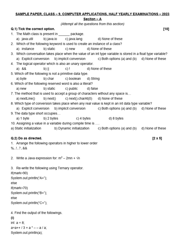 SAMPLE PAPER, CLASS – 9, COMPUTER APPLICATIONS, HALF YEARLY EXAMINATIONS – 2023