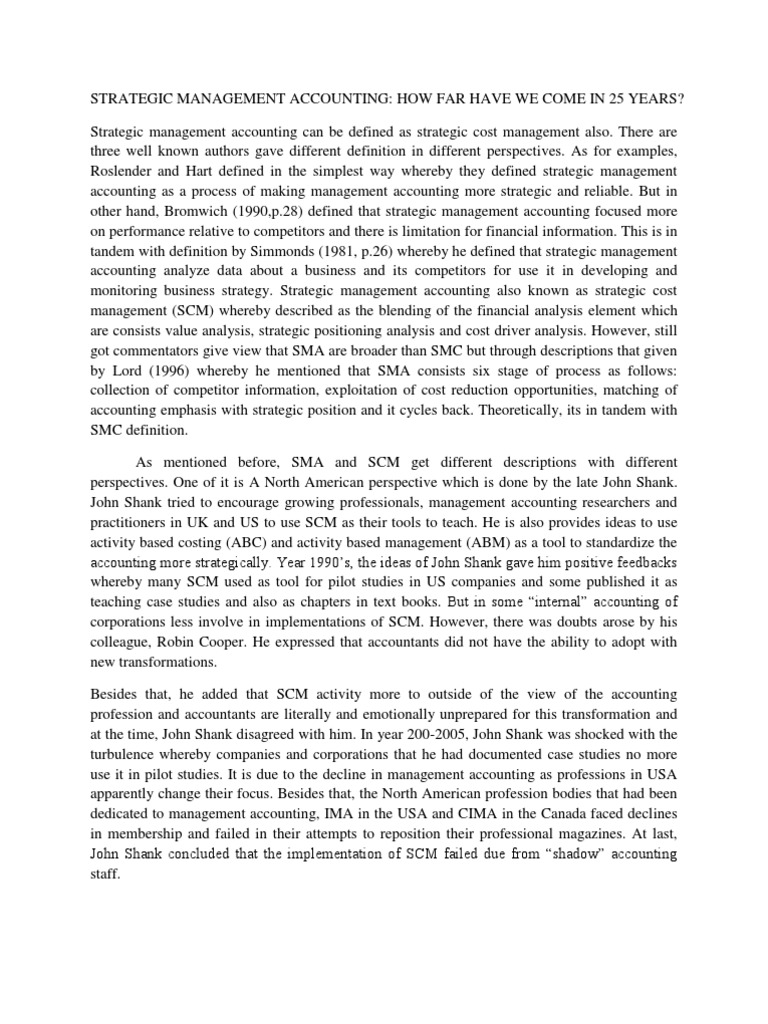 Strategic management accounting can be defined as strategic cost management also. There are three well known authors gave different definition in different perspectives. As for examples, Roslender and Hart defined in the simplest way whereby they defined strategic management accounting as a process of making management accounting more strategic and reliable. But in other hand, Bromwich (1990,p.28) defined that strategic management accounting focused more on performance relative to competitors and there is limitation for financial information. This is in tandem with definition by Simmonds (1981, p.26) whereby he defined that strategic management accounting analyze data about a business and its competitors for use it in developing and monitoring business strategy. Strategic management accounting also known as strategic cost management (SCM) whereby described as the blending of the financial analysis element which are consists value analysis, strategic positioning analysis and cost driver analysis. However, still got commentators give view that SMA are broader than SMC but through descriptions that given by Lord (1996) whereby he mentioned that SMA consists six stage of process as follows: collection of competitor information, exploitation of cost reduction opportunities, matching of accounting emphasis with strategic position and it cycles back. Theoretically, its in tandem with SMC definition. As mentioned before, SMA and SCM get different descriptions with different perspectives. One of it is A North American perspective which is done by the late John Shank. John Shank tried to encourage growing professionals, management accounting researchers and practitioners in UK and US to use SCM as their tools to teach. He is also provides ideas to use activity based costing (ABC) and activity based management (ABM) as a tool to standardize the accounting more strategically. Year 1990s, the ideas of John Shank gave him positive feedbacks whereby many SCM used as tool for pilot studies in US companies and some published it as teaching case studies and also as chapters in text books. But in some internal accounting of corporations less involve in implementations of SCM. However, there was doubts arose by his colleague, Robin Cooper. He expressed that accountants did not have the ability to adopt with new transformations. Besides that, he added that SCM activity more to outside of the view of the accounting profession and accountants are literally and emotionally unprepared for this transformation and at the time, John Shank disagreed with him. In year 200-2005, John Shank was shocked with the turbulence whereby companies and corporations that he had documented case studies no more use it in pilot studies. It is due to the decline in management accounting as professions in USA apparently change their focus. Besides that, the North American profession bodies that had been dedicated to management accounting, IMA in the USA and CIMA in the Canada faced declines in membership and failed in their attempts to reposition their professional magazines. At last, John Shank concluded that the implementation of SCM failed due from shadow accounting staff.