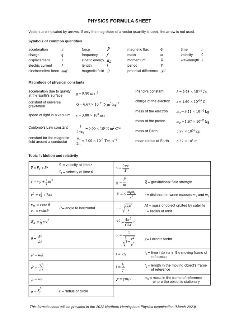 This formula sheet will be provided in the 2022 Northern Hemisphere Physics examination (March 2023).