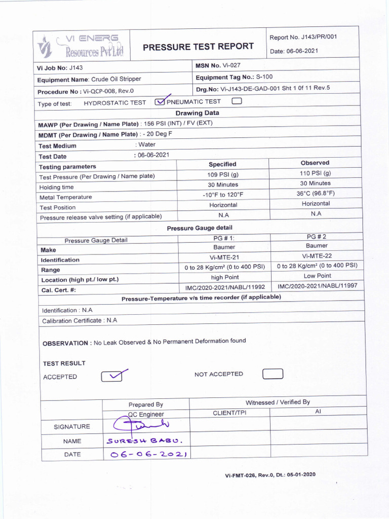 OBSERVATION : No Leak Observed & No Permanent Deformation found