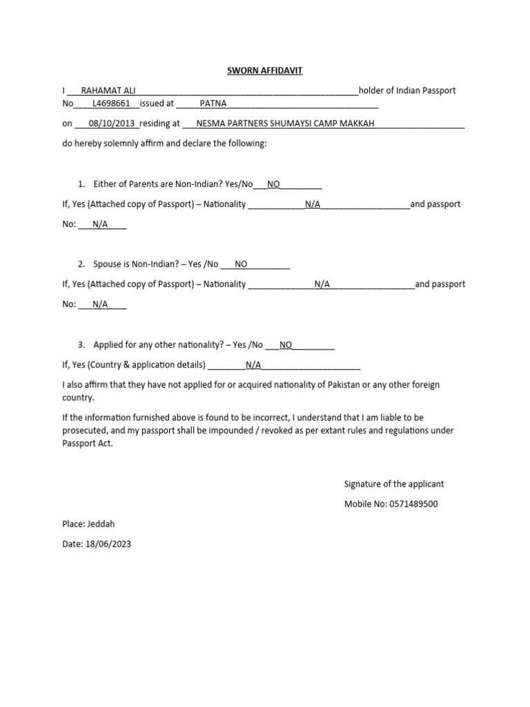 I ___RAHAMAT ALI_______________________________________________holder of Indian Passport