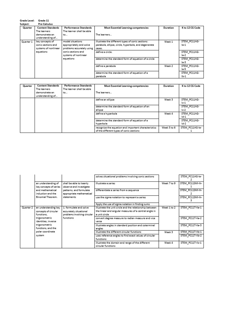 Quarter Content Standards Performance Standards Most Essential Learning competencies Duration K to 12 CG Code