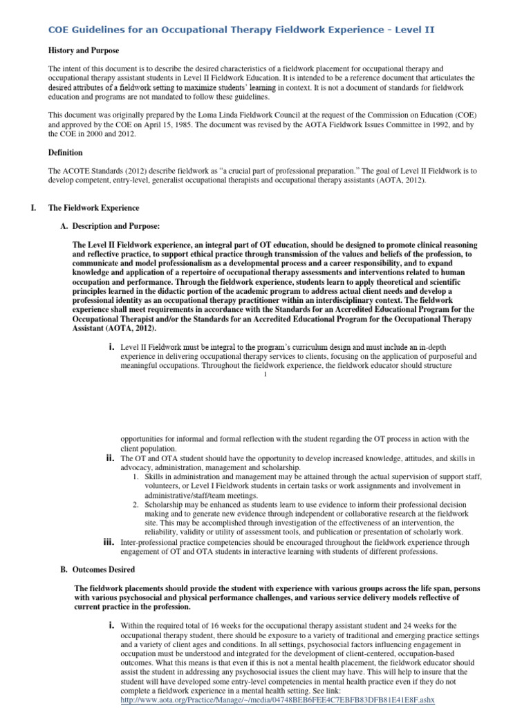 The ACOTE Standards (2012) describe fieldwork as “a crucial part of professional preparation.” The goal of Level II Fieldwork is to