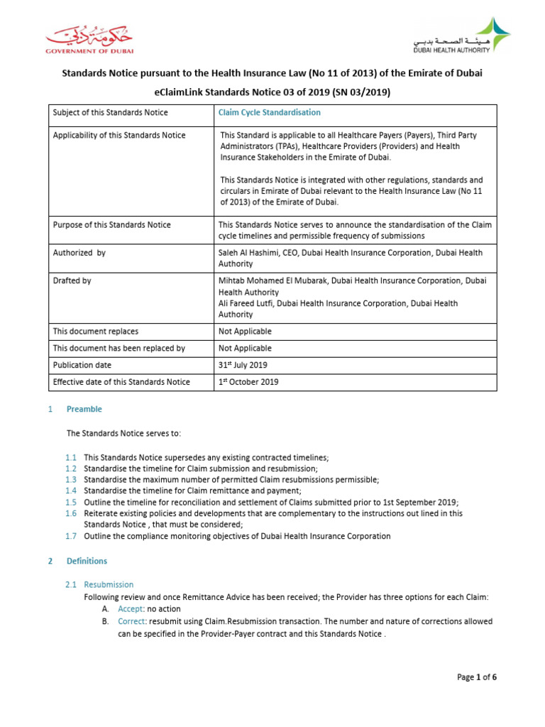 Standards Notice pursuant to the Health Insurance Law (No 11 of 2013) of the Emirate of Dubai