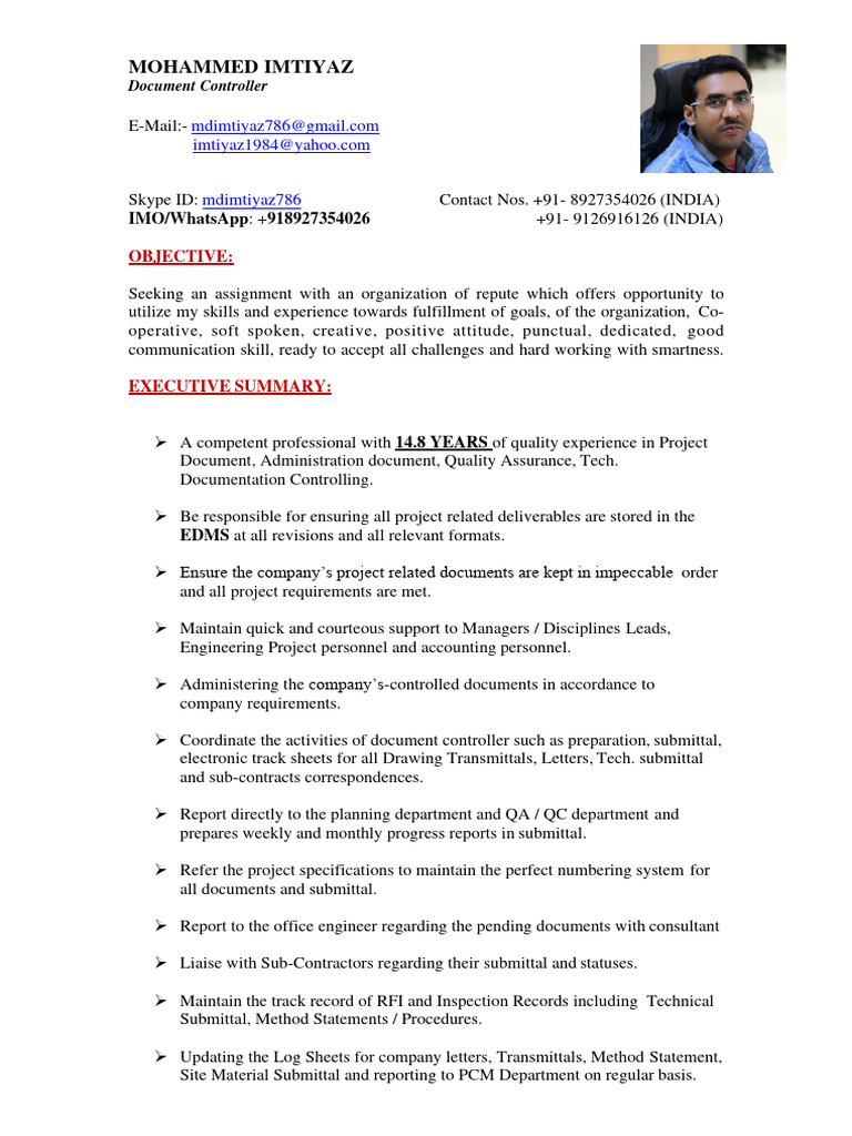 ➢ Coordinate the activities of document controller such as preparation, submittal,