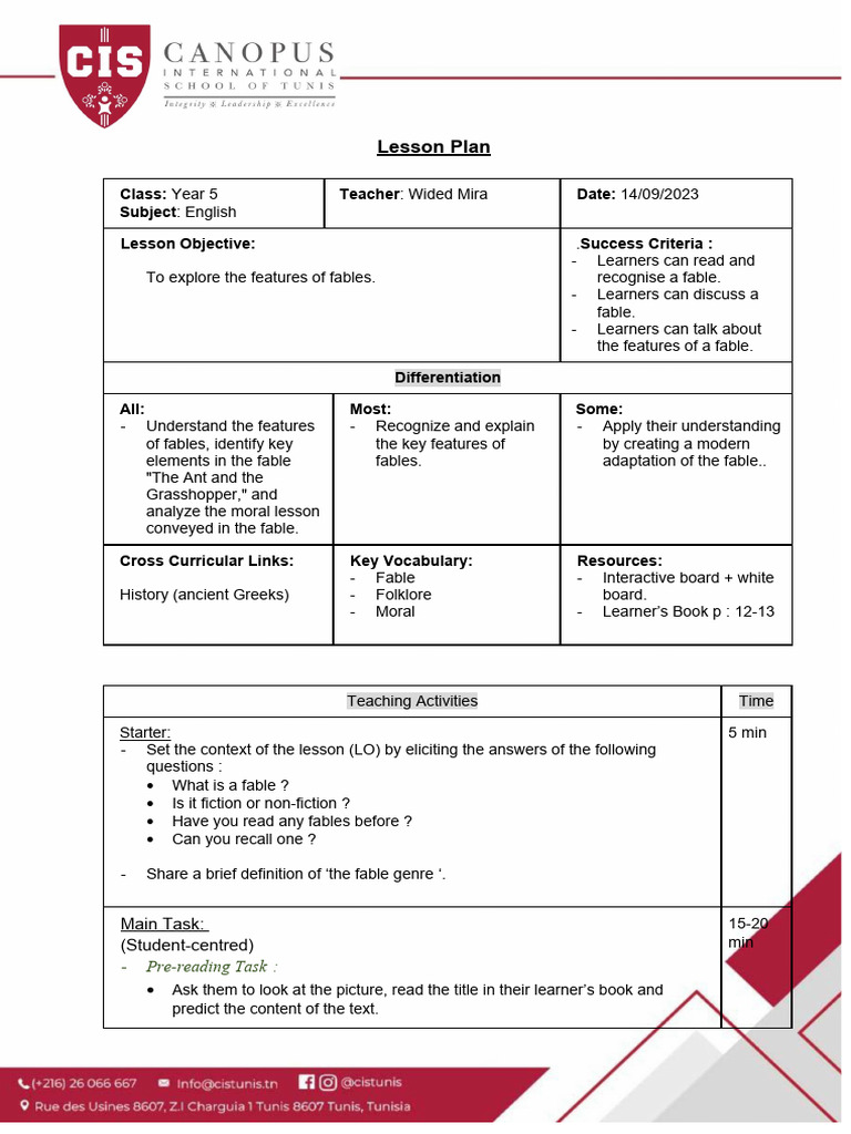 Class: Year 5 Teacher: Wided Mira Date: 14/09/2023