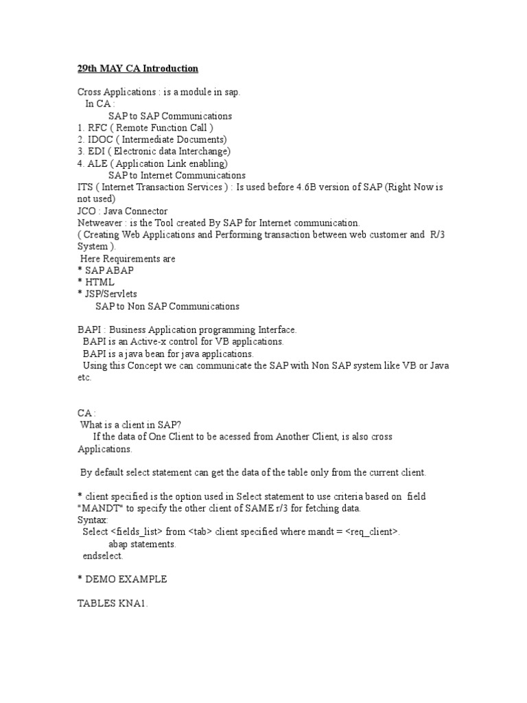Cross applications : IS A module in sap. SAP to SAP Communications 1. RFC ( Remote Function Call ) 2. IDOC ( Intermediate Documents) 3. EDI ( Electronic data Interchange) 4. ALE ( Applicatio…