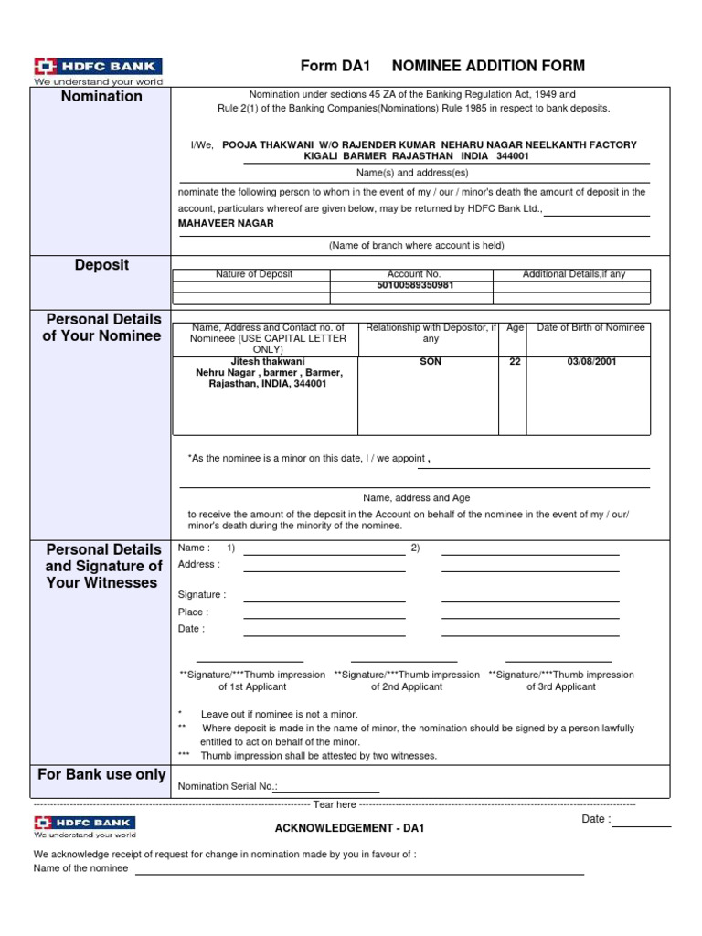 Personal Details Name, Address and Contact no. of Relationship with Depositor, if Age Date of Birth of Nominee