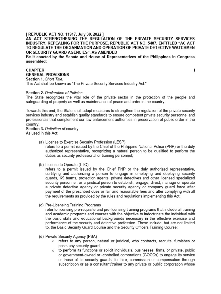 AN ACT STRENGTHENING THE REGULATION OF THE PRIVATE SECURITY SERVICES