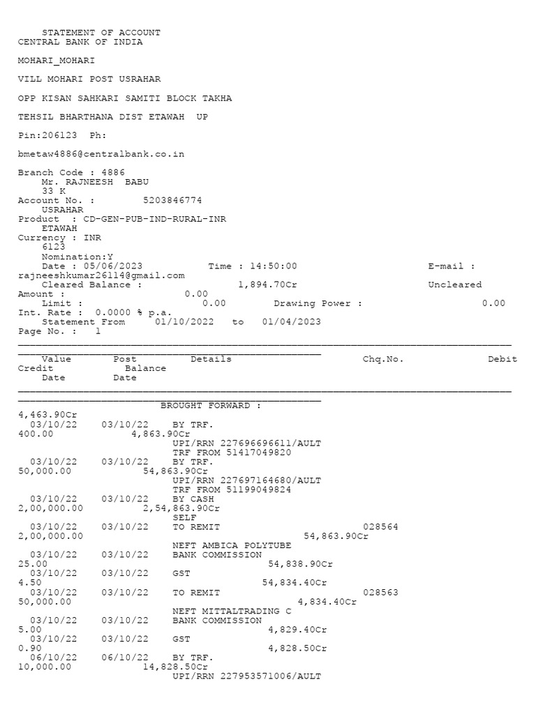 Central Bank of India Account Statement