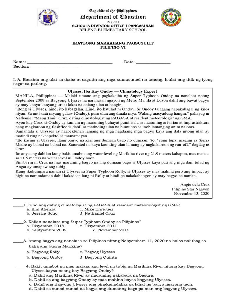 I. A. Basahin ang ulat sa ibaba at sagutin ang mga sumusunod na tanong. Isulat ang titik ng iyong