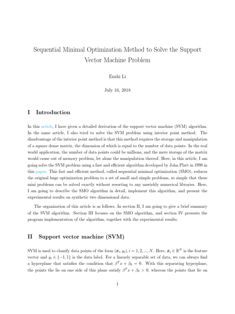 of the SVM algorithm. Section III focuses on the SMO algorithm, and section IV presents the