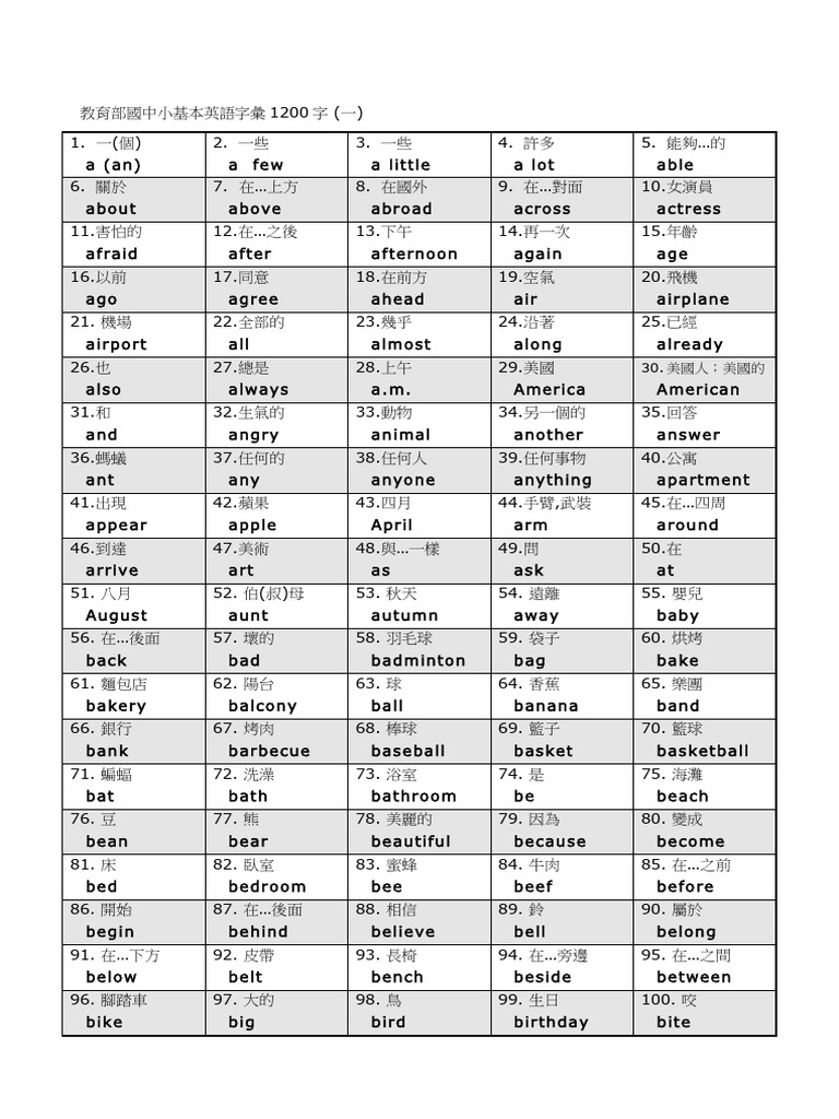 教育部國中小基本英語字彙 1200 字 (一)