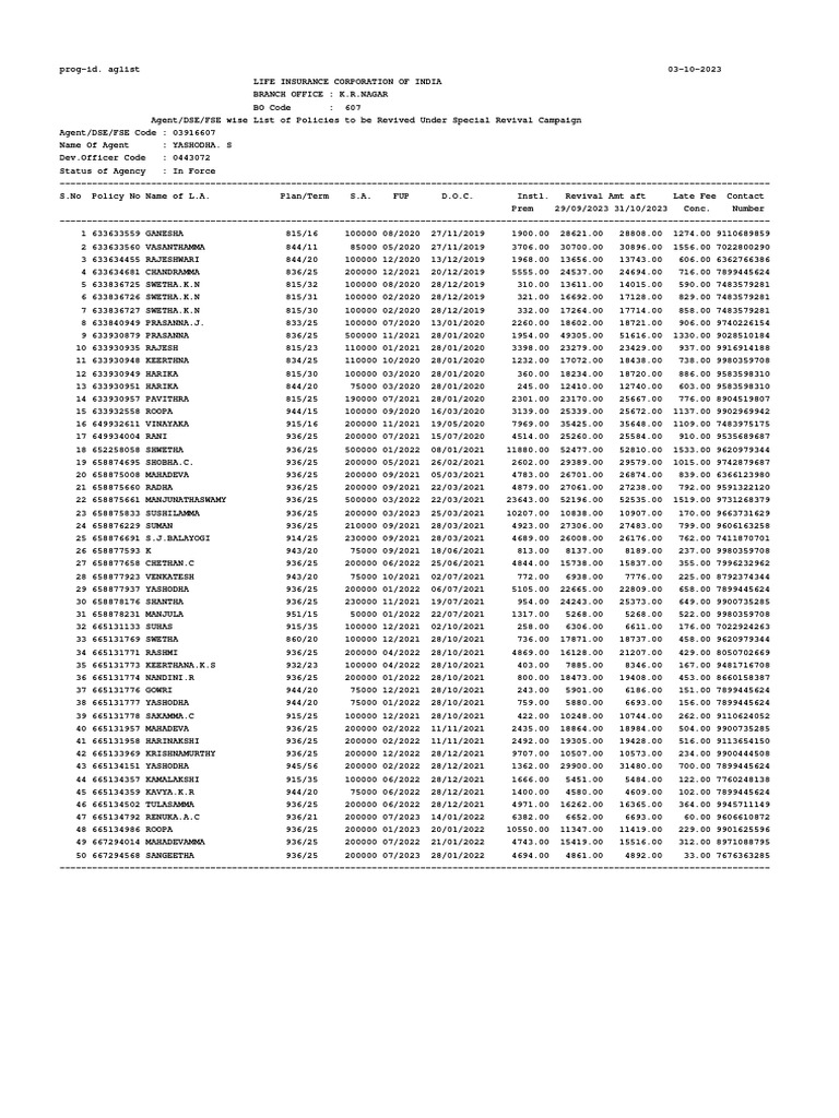 S.No Policy No Name of L.A. Plan/Term S.A. FUP D.O.C. Instl. Revival Amt aft Late Fee Contact