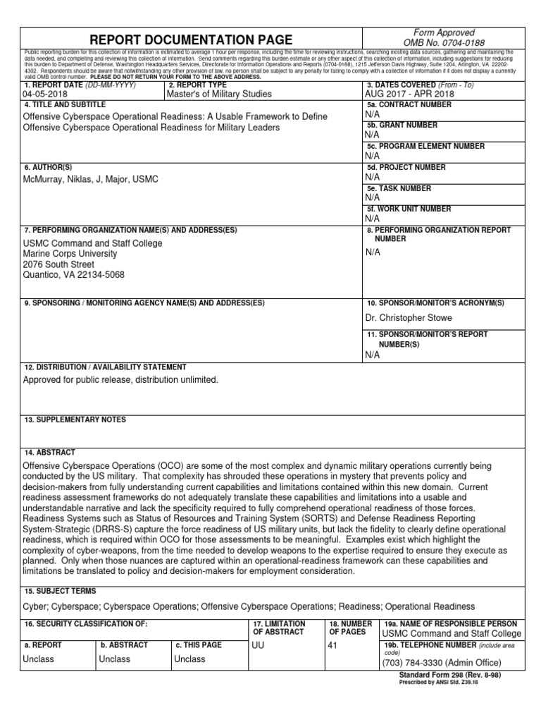 Cyber; Cyberspace; Cyberspace Operations; Offensive Cyberspace Operations; Readiness; Operational Readiness