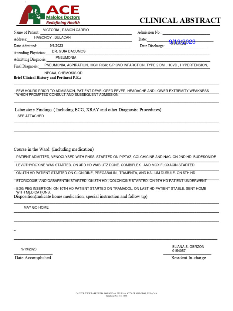 PNEUMONIA, ASPIRATION, HIGH RISK; S/P CVD INFARCTION, TYPE 2 DM , HCVD , HYPERTENSION,