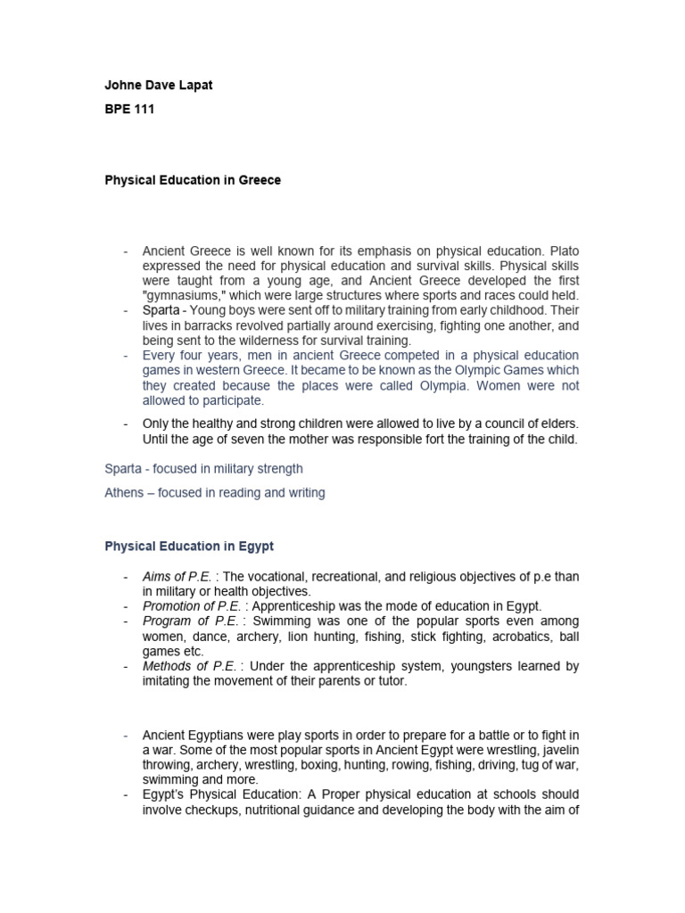 - Promotion of P.E. : Apprenticeship was the mode of education in Egypt.