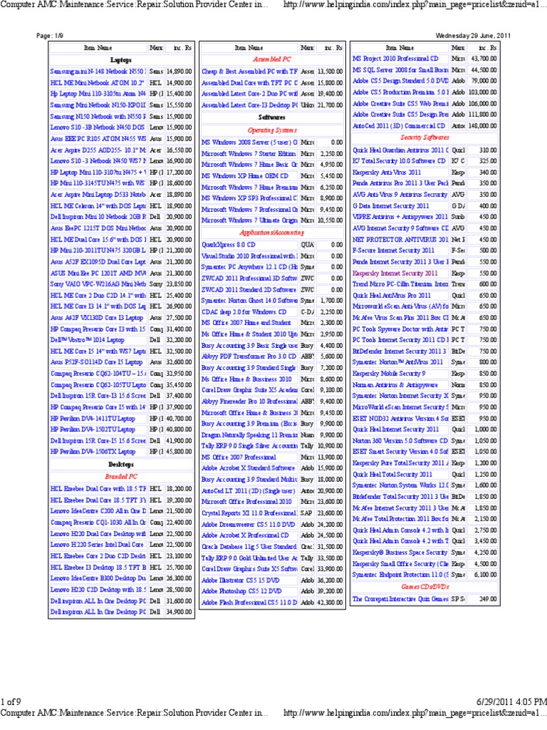 Page: 1/9 Item Name Laptops Manufacturer Rs inc. Item Name Assembled PC Manufacturer Rs inc. Item Name