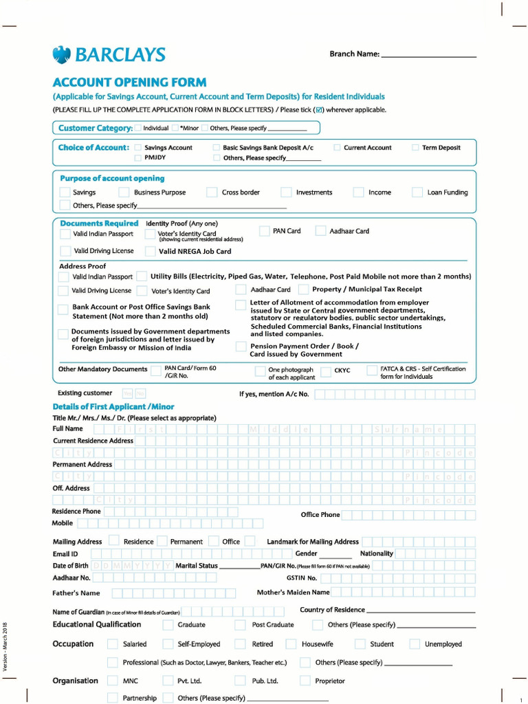 (Applicable for Savings Account, Current Account and Term Deposits) for Resident Individuals