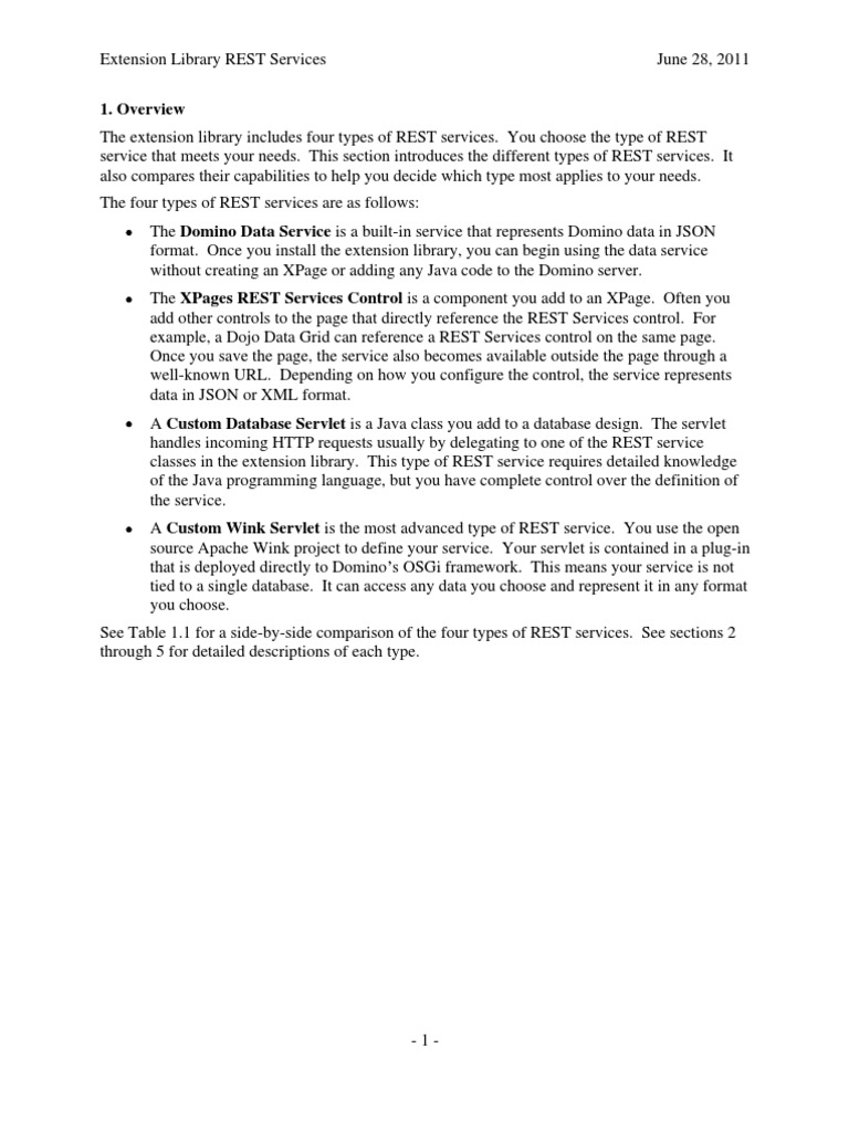 The extension library includes four types of REST services. You choose the type of REST service that meets your needs. This section introduces the different types of REST services. It also compares their capabilities to help you decide which type most applies to your needs. The four types of REST services are as follows: The Domino Data Service is a built-in service that represents Domino data in JSON format. Once you install the extension library, you can begin using the data service without creating an XPage or adding any Java code to the Domino server. The XPages REST Services Control is a component you add to an XPage. Often you add other controls to the page that directly reference the REST Services control. For example, a Dojo Data Grid can reference a REST Services control on the same page. Once you save the page, the service also becomes available outside the page through a well-known URL. Depending on how you configure the control, the service represents data in JSON or XML format. A Custom Database Servlet is a Java class you add to a database design. The servlet handles incoming HTTP requests usually by delegating to one of the REST service classes in the extension library. This type of REST service requires detailed knowledge of the Java programming language, but you have complete control over the definition of the service. A Custom Wink Servlet is the most advanced type of REST service. You use the open source Apache Wink project to define your service. Your servlet is contained in a plug-in that is deployed directly to Domino s OSGi framework. This means your service is not tied to a single database. It can access any data you choose and represent it in any format you choose. See Table 1.1 for a side-by-side comparison of the four types of REST services. See sections 2 through 5 for detailed descriptions of each type.