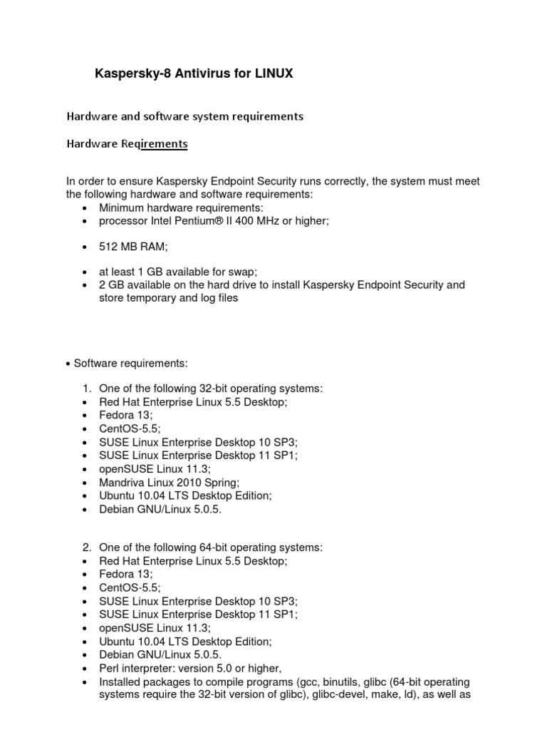 Kaspersky-8 Antivirus for LINUX Hardware and software system requirements Hardware Reqirements
