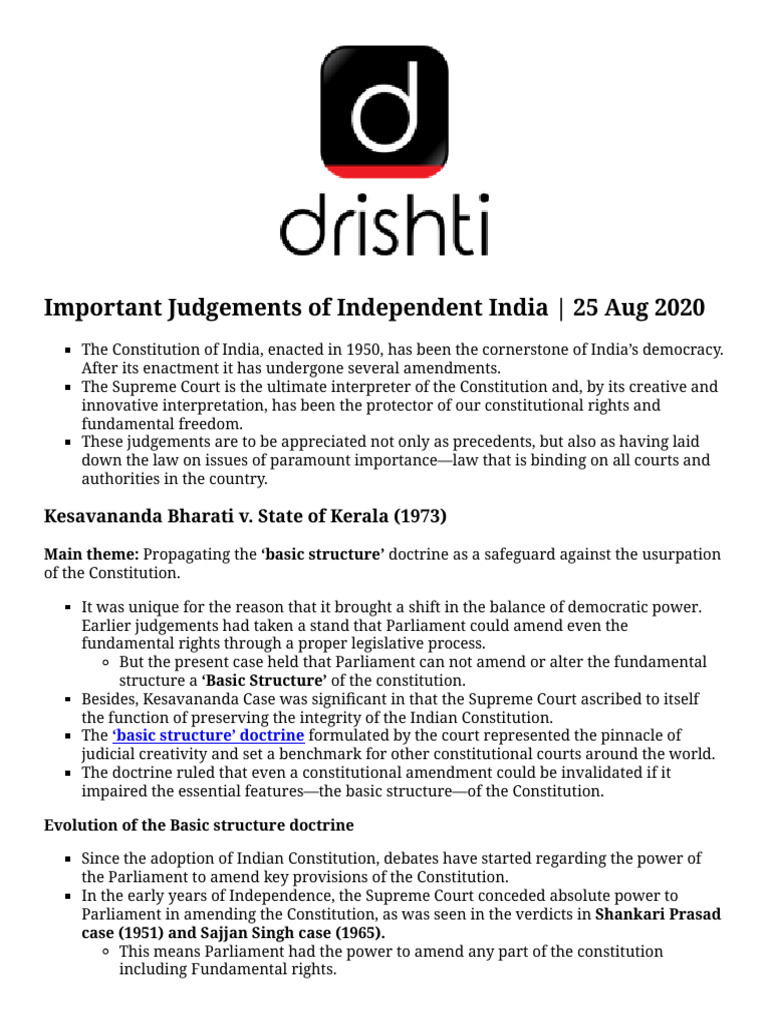 Important Judgements of Independent India | 25 Aug 2020