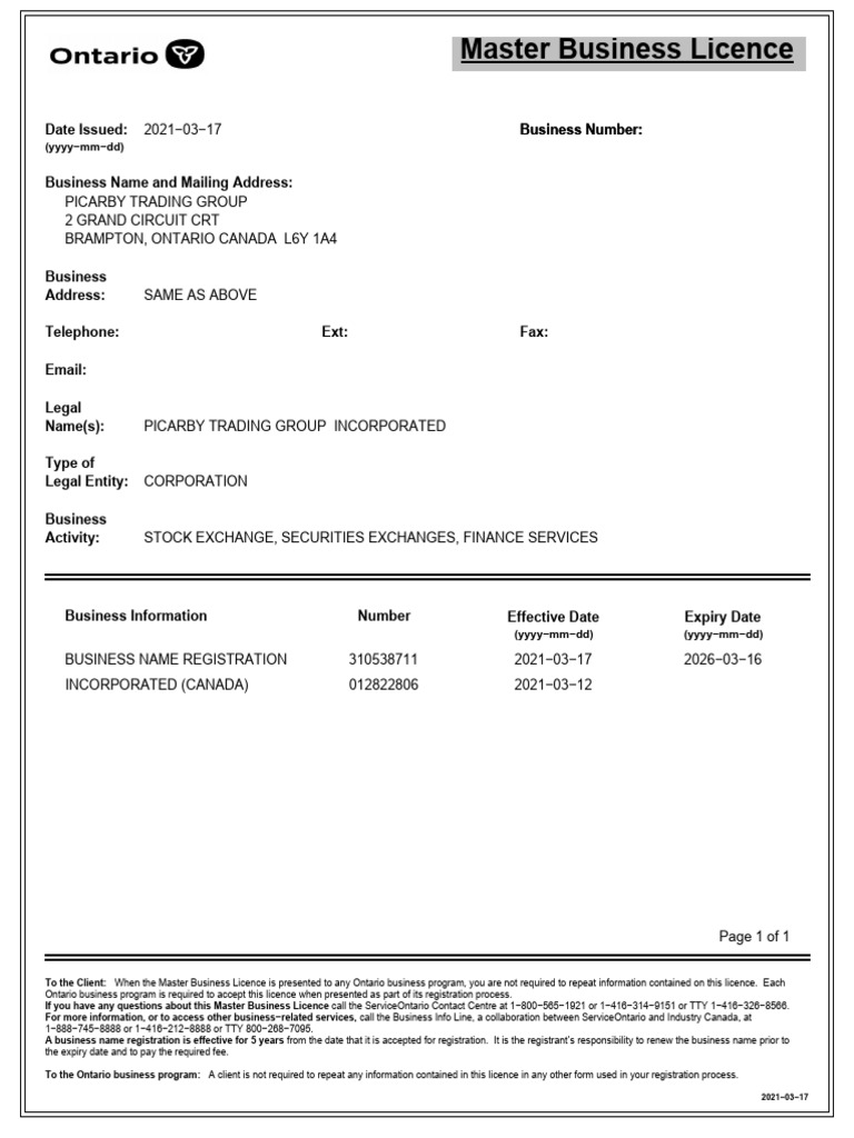 To the Client: When the Master Business Licence is presented to any Ontario business program, you are not required to repeat information contained on this licence. Each