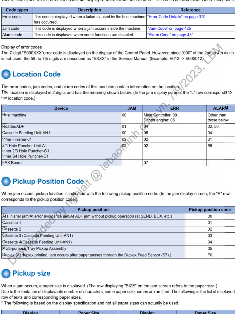 The error codes, jam codes, and alarm codes of this machine contain information on the location.