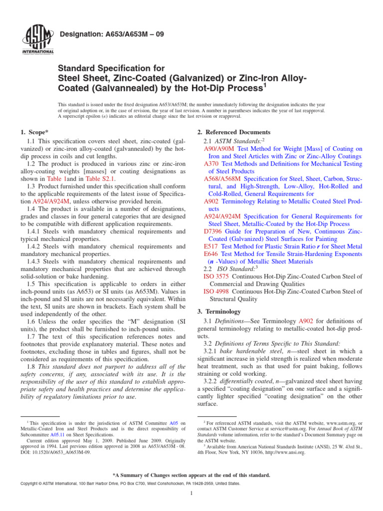 approved in 1994. Last previous edition approved in 2008 as A653/A653M - 08. Available from American National Standards Institute (ANSI), 25 W. 43rd St.,