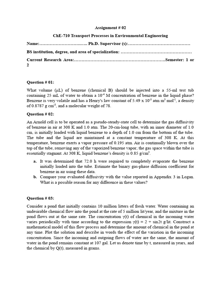 ChE-710 Transport Processes in Environmental Engineering