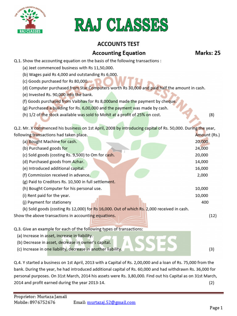 Q.1. Show the accounting equation on the basis of the following transactions :