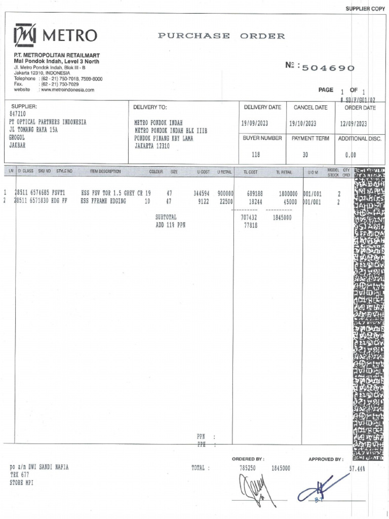 PY OPTICAL PARTNERS INDONESIA ‘HBTEO PORDOR INDAH 30/09/2023 30/10/2023 29/09/2023